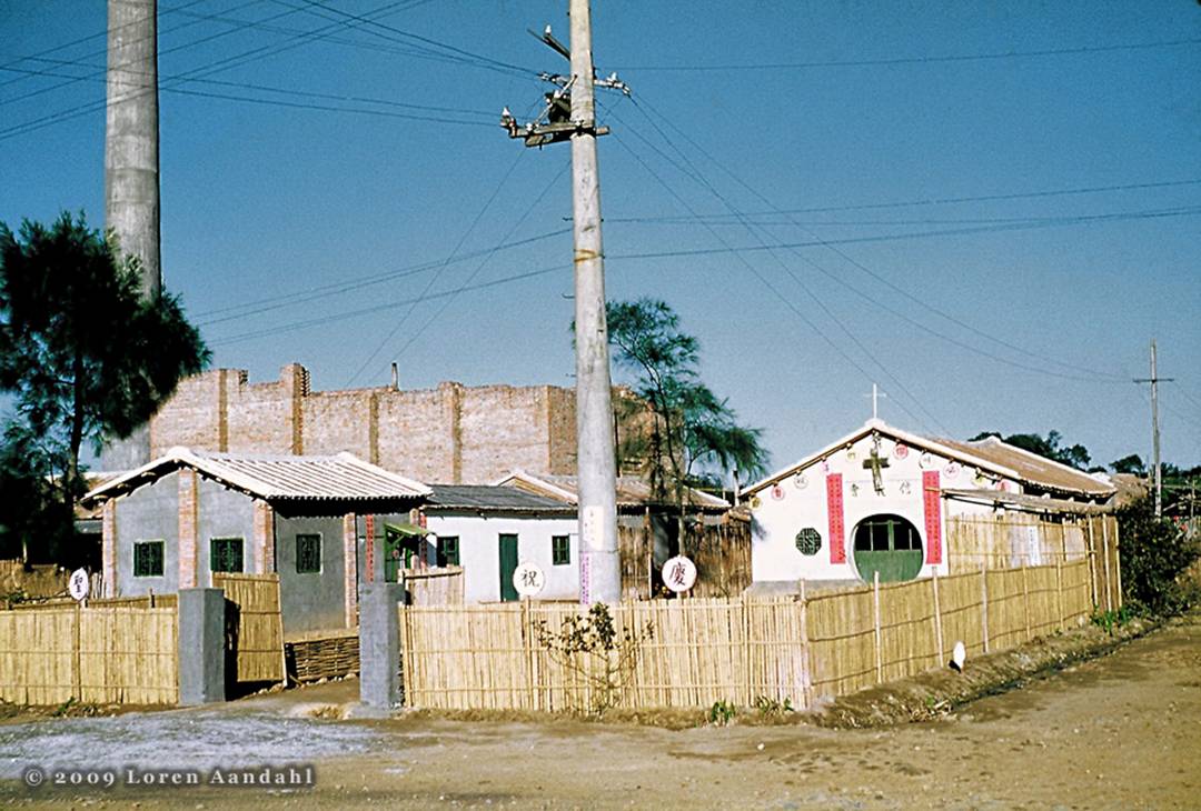 Looming behind Victory Church were the ruins of an imposing industrial facility. According to Bruce Rayle's friend, Juju Wang, this factory was involved in the production of synthetic fuels for the Japanese Navy during World War II. It was bombed by American bomber aircraft in late 1944 or 1945. This photograph was probably taken later in 1955 after a new bamboo fence had been built around the church property. Read more about this factory in The Rayle Family's subsection under the Hsinchu category on this same website. |