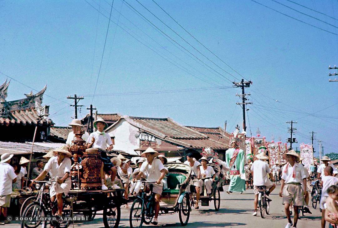 A crowded street scene in Hsinchu, c.1956, during a parade of the idols from the temple to the Gods of Heaven and Hell. Most idols at this temple were very tall and imposing and were carried by a man inside only half their height. Loud music is being played by the mainly percussion instruments on the pedi-cart on the left of the photograph. |