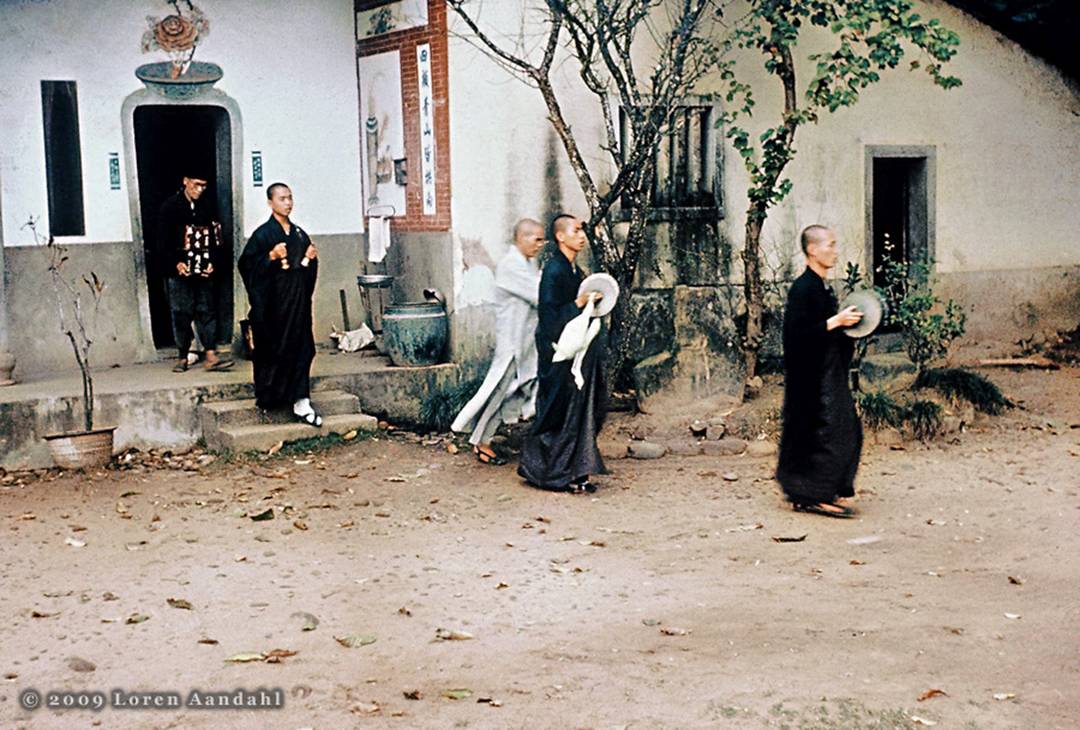 Buddhist monks make their way out of their temple at Green Grass Lake, 3 kilometers outside of Hsinchu, c. 1956. In their hands they hold a variety of musical instruments. Per Elliot Aandahl's written notes on the slide, this was a funeral procession so I assume the monk just leaving the doorway is holding an urn containing ashes although I cannot easily identify the object he is holding as an urn.