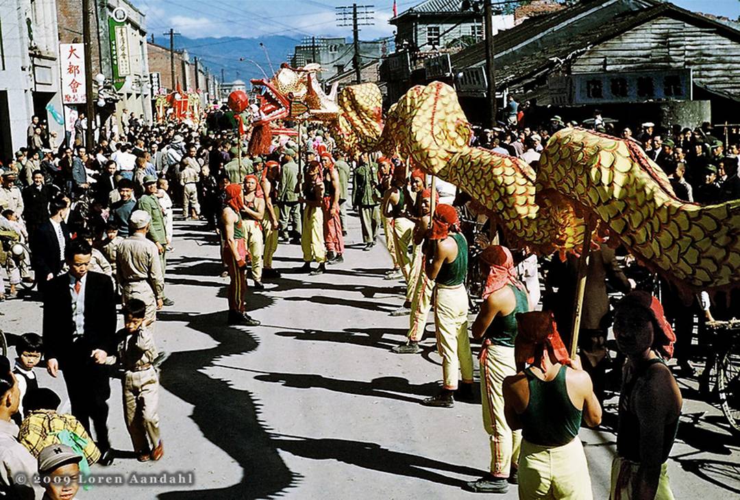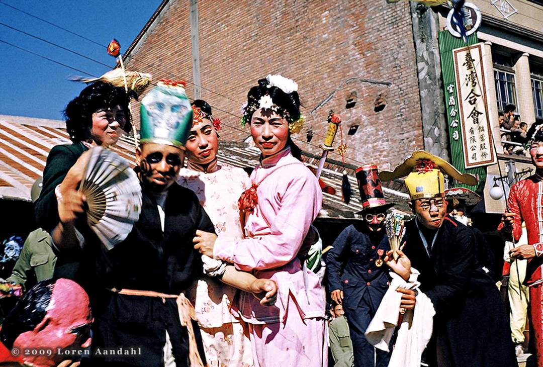 At this festival in Ilan in northeastern Taiwan in 1957, street dancers made up in variety of costumes turn their attention to my father, Elliot Aandahl, as he captures their colorful images. |