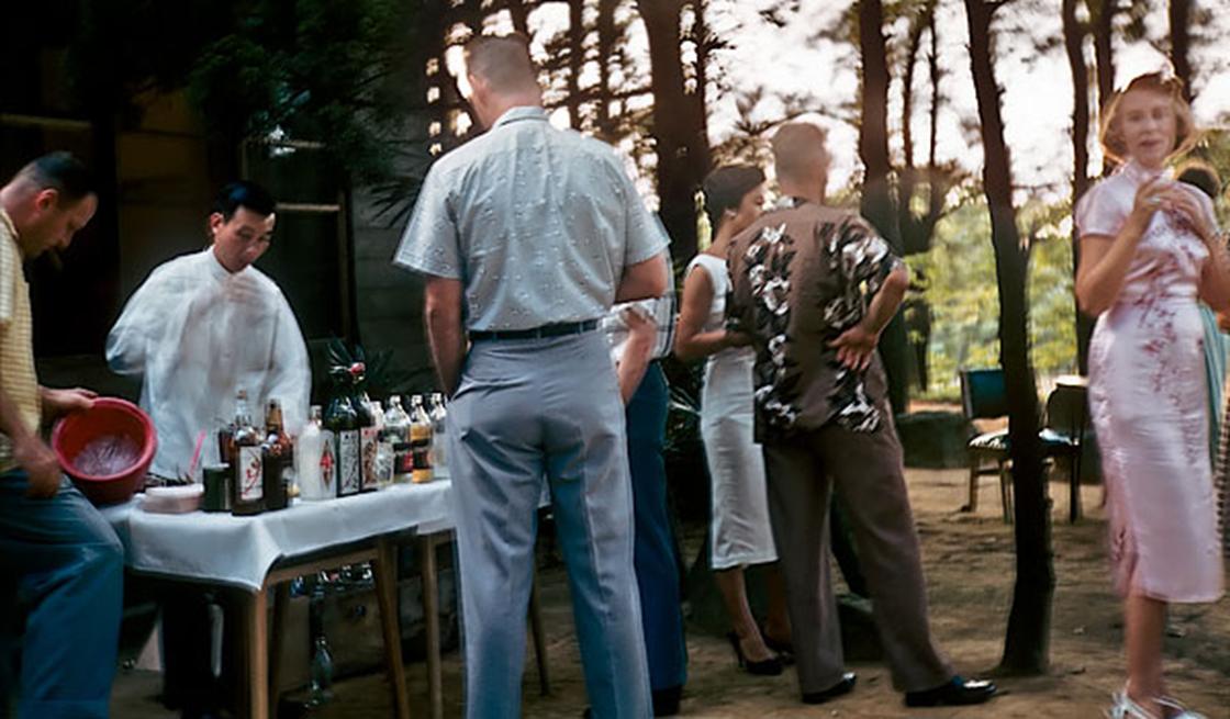 A barbeque held outside at the Hsinchu Officer’s Club, circa 1958-1959. A nice day to enjoy the outdoors. Seen just walking out of the picture in her pink Cheongsam dress is Dorothy Rayle. Not often did she have an opportunity to wear such a beautiful dress. Look at this group, this picture could have been taken this afternoon. They styles have not changed in 50 years. I even recognize a bottle of Gordon’s Gin on the bar table. Let’s take a break and sit down, enjoy life on this lazy afternoon in Hsinchu 50 years ago….. Cheers... |