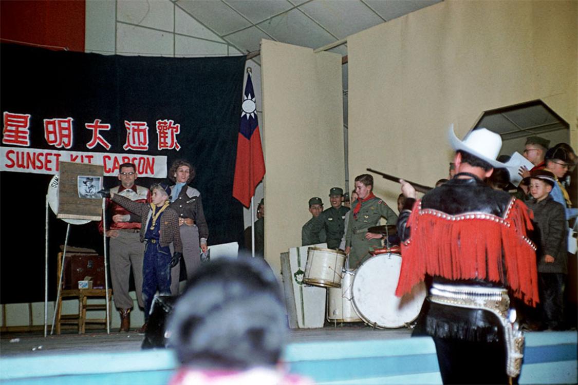 Here’s one of the brave Cub Scout youngsters, Roy’s Son Brian, holding up a photograph while Kit attempts to blow a hole right through it. You remember basic training and the rifle range, wonder how Kit’s shooting encouraged the ROC soldiers in attendance that evening. When it was Bruce’s turn to hold out the photo, the man standing next to the target shook Bruce’s arm to make it appear Bruce was nervous, that brought a good laugh from all. Bruce is the tallest kid, standing on the side of the stage, holding onto a photo to be used when it’s his turn to walk up to target area. How far we have come - try this today and you would be calling home from the cell block, changed with child endangerment of some sort. These MAAG children were standing anxiously awaiting their turns, with hope that Kit would keep firing until their turn arrived to step up to the target area. What chatter must have taken place between the boys on the long bus ride back home that evening so long ago. |