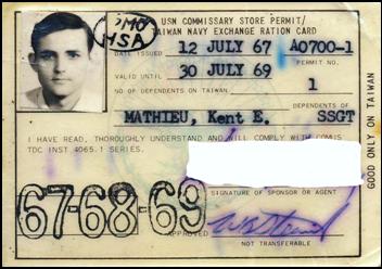 Here was the “Gold Card” of cards. This card got you into the Navy Exchange and Commissary. The back of the card held the monthly ration authorization of cigarettes and beer. |