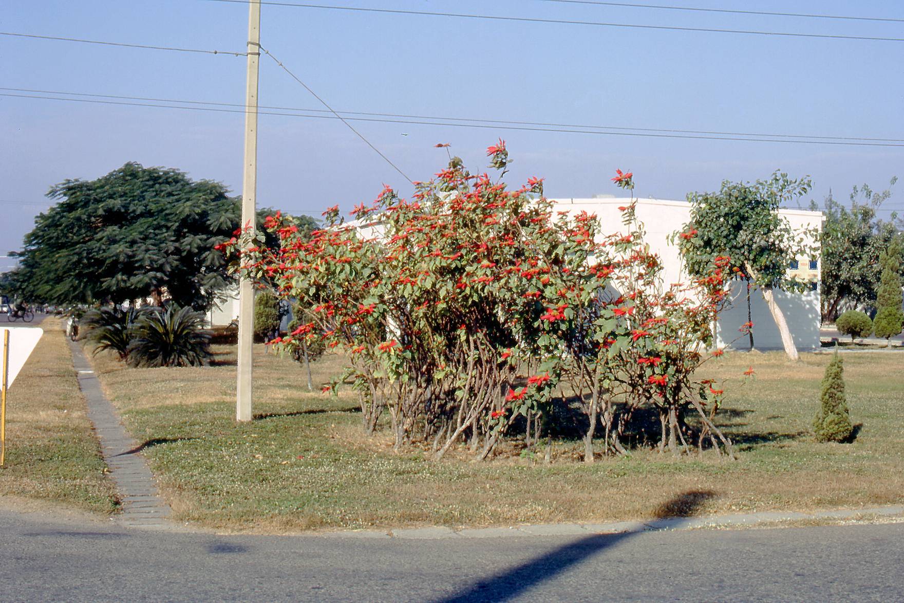 These look like poinsettias, must be around Christmas time. Can someone please ID the building, small unusual windows on the end of the building?
