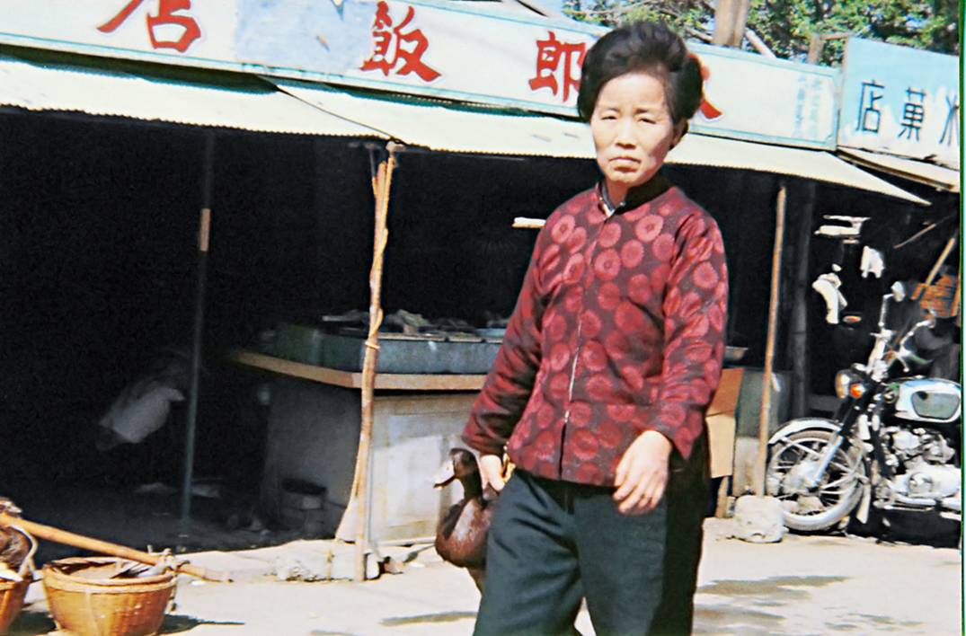 A lady on the way home. Did you examine the picture closely? What is she carrying for dinner? |