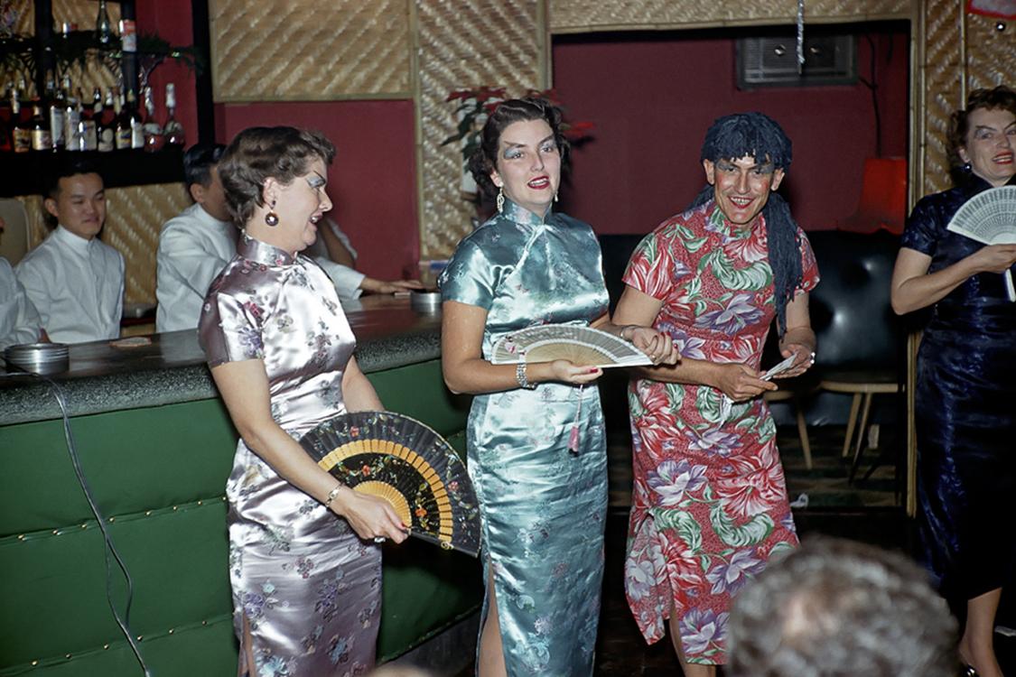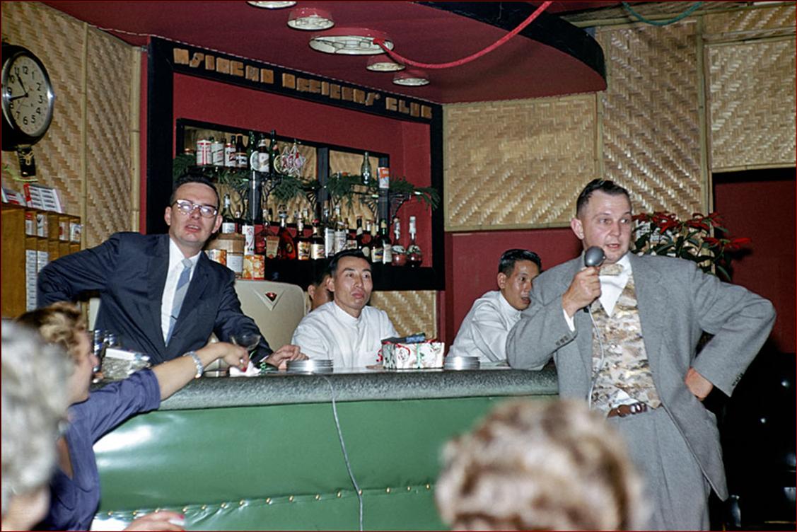 More of the Christmas Party in 1958. The laughter continues. US Army Officer William Sands in his red dress, standing to the far left holding the opened black fan is his wife Betty. The lady in the light blue dress between Bill and Betty could not be identified. The woman standing on the far right in the dark blue dress is believed to be Alice Spangler. I am wondering what music the “ladies” sang to, or was it a fan dance for the audience? Hummm |