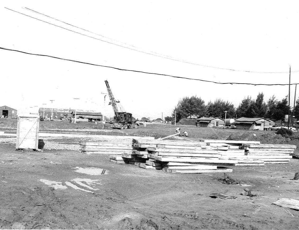 Interesting picture. The water lines are going in, but, who knows where on Tainan AB this picture was taken from. I don’t think it was shot from the water tower. My guess, one of Jim’s friends hoisted Jim up-high using the crane and Jim was able to shoot this picture. I notice a few things here. Some ammo bunkers, a few POL tractors and trailers and some military tents off to the right side. Could this shot be looking at the main base across the runway? If you look closely, you can make out what appears to be a large aircraft just in the center top of this picture, and maybe the control tower along the string of buildings to the left of the aircraft?