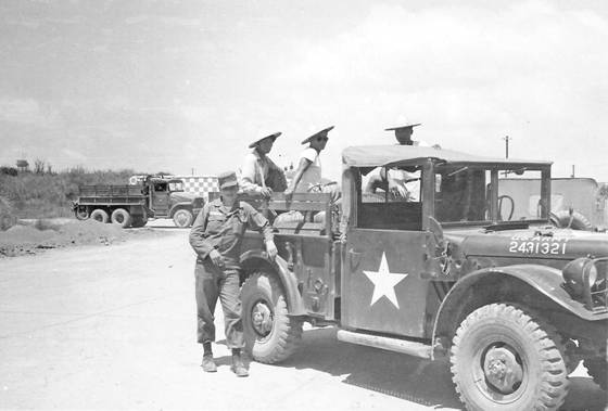Jim’s home away from home, located right on the taxi way. Can you image being asleep in the middle of the night and one of those F-86’s passes your front door toward the runway to take off? Guaranteed nightmares! Windy today, those palm trees area leaning heavy. These guys showed up to help build Tainan AB and while they were there, they made their skimpy quarters look nice, planted trees, put in butt cans, brick curbing and even brought in electrical power. A nice looking place. |