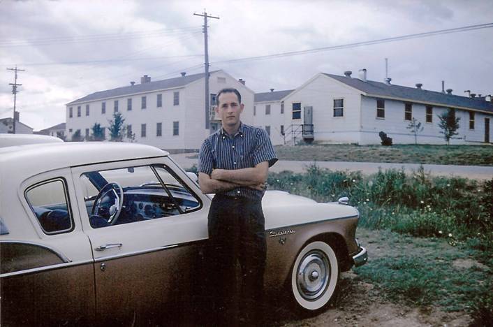 Jim, about June 1959 at Fort Carson standing beside a 1957 Studebaker. Jim left the Army in July 1959. |